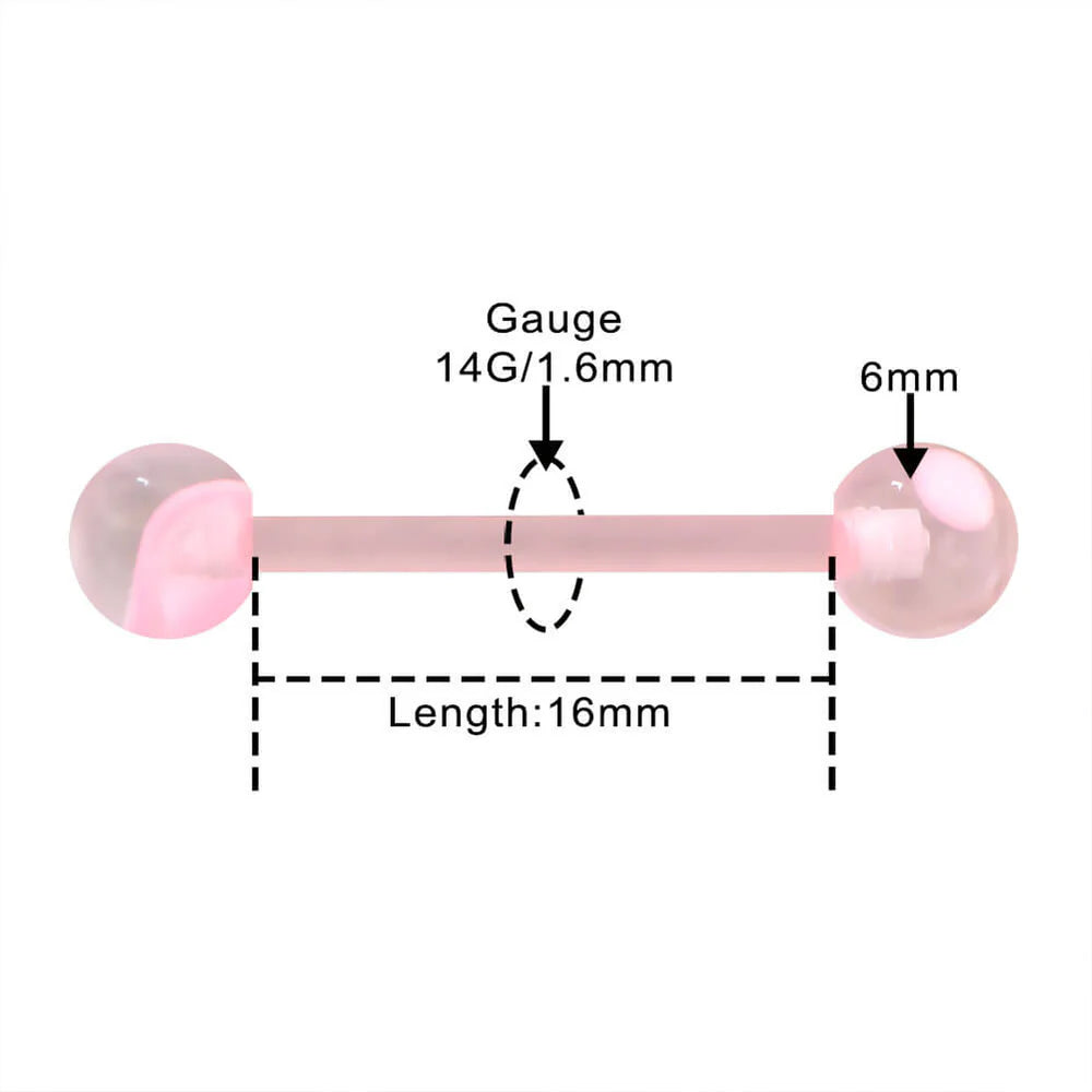 Bar thickness: 14G/ 1.6mm, and bar length: 16mm.